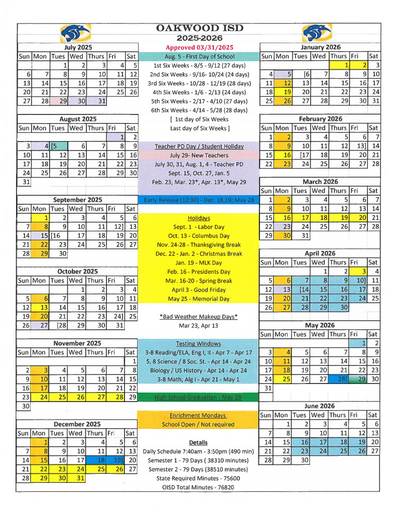 Oakwood ISD Calendar 2025-2026